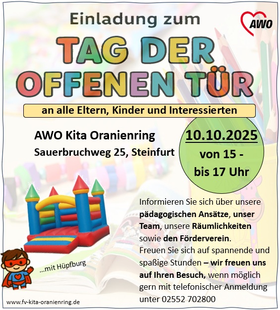 Dieses Jahr findet in den AWO-Kindergärten in Steinfurt/Borghorst am 10.10.2025 von 15-17:00Uhr der Tag der offenen Tür statt.